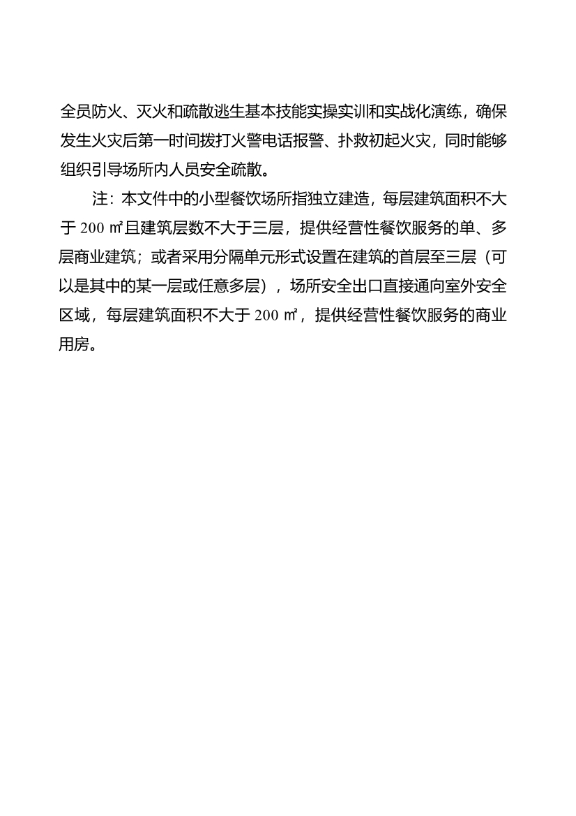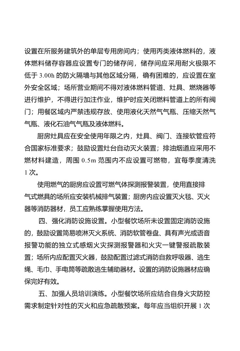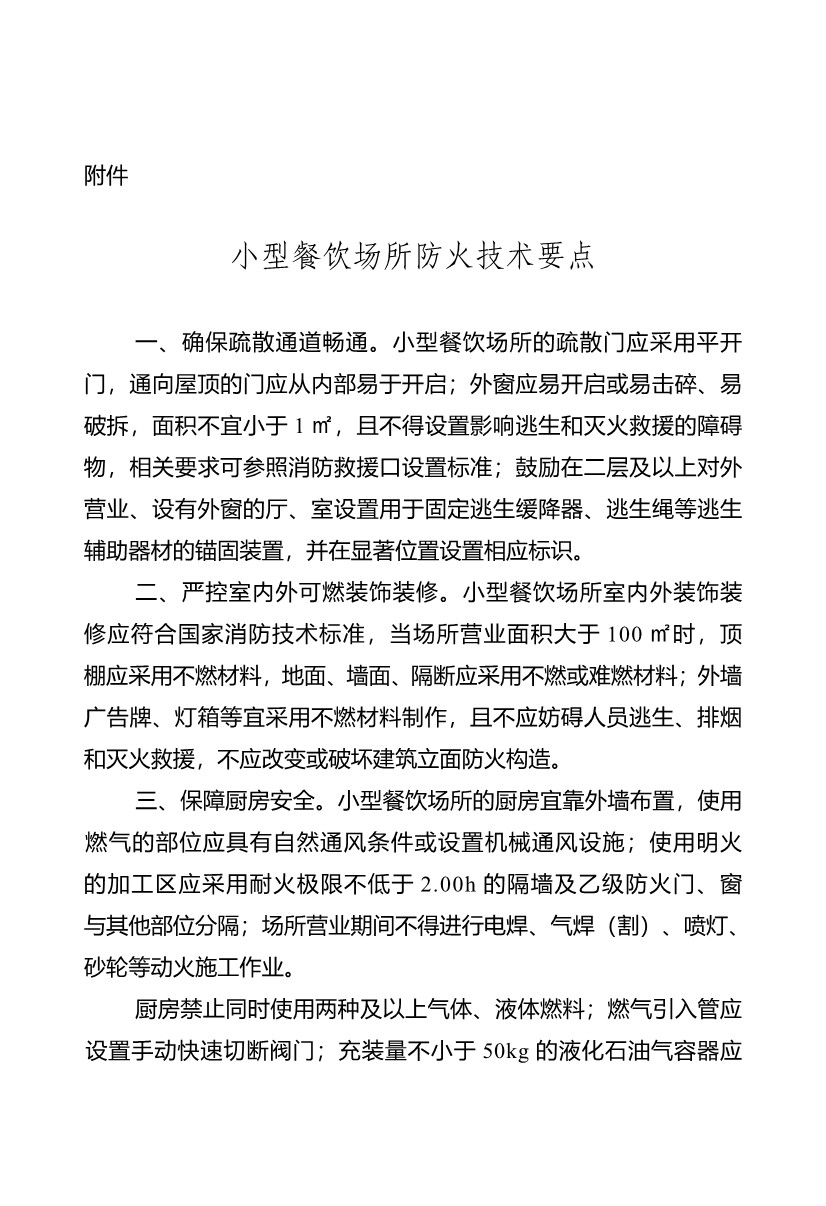国务院安委会办公室关于坚决防范遏制小型餐饮场所群死群伤火灾事故的通知(安委办〔2025〕3号)时间:2025-10-20 各省、自治区、直辖市及新疆生产建设兵团安全生产委员会,国务院安委会有关成员单位: 近年来,吉林长春、宁夏银川、辽宁辽阳等地接连发生小型餐饮场所重特大火灾爆炸事故,造成重大人员伤亡,教训极为深刻,暴露出小型餐饮场所监管责任缺失、安全管理不到位、本质安全条件较低、从业人员安全素质不高等问题。为认真贯彻落实习近平总书记重要指示精神,深刻汲取近年来小型餐饮场所重特大火灾爆炸事故教训,切实举一反三,采取更强有力的措施,坚决防范遏制重特大火灾事故发生,现提出以下工作要求。 一、强化系统治理,压紧压实各级消防安全责任。小型餐饮场所要按照“谁所有谁负责、谁经营谁管理”的原则,严格落实消防安全主体责任,确定1名消防安全责任人,具体组织实施本场所日常消防安全管理工作。实行承包、租赁或者委托经营、管理时,产权方、出租方等应当提供符合消防安全条件的建筑,在订立合同中应当依照有关规定明确并履行各方消防安全职责。各地区要严格落实小型餐饮场所的属地消防管理责任,研究落实消防安全防控措施,解决区域性、系统性重大安全问题,明确消防救援部门依法行使消防安全综合监管和专业监管职责,强化火灾预防和消防监督执法,加强统筹协调;明确住房城乡建设、消防救援、应急管理、市场监管、城市管理等相关部门有关燃气安全、动火作业、装饰装修材料、预案制定、广告牌匾审批等具体职责分工;明确商务主管部门行业管理职责,配合有关监管部门指导督促餐饮企业贯彻执行消防法律法规,加强安全管理,落实安全防范措施。鼓励各地区将相关职责纳入部门权责清单,建立联合监管协作机制,形成工作合力。 二、发动各方力量,深入查改消防安全隐患问题。各地区要组织小型餐饮场所开展自查自改,对照国家消防技术标准和《小型餐饮场所防火技术要点》(见附件),重点围绕“疏散逃生、装饰装修、厨房安全、消防设施、培训演练”等方面,主动查改安全隐患,加强自律管理。要发动基层配合做好小型餐饮场所易发现、易处置消防安全隐患的日常排查,对发现的问题及时制止。在小型餐饮场所集中区域的显著位置,提示常见风险隐患,公布举报投诉方式,发动群众报告身边的安全隐患,实施群防群治。住房城乡建设、应急管理、市场监管、消防救援、城市管理等部门要按照各自职责,依法依规加强监督检查,对发现的隐患问题,以引导规范、预防纠正为主,综合施策,立行立改、闭环管理;商务主管部门要加强行业督促指导,发现的隐患线索及时移交相关监管部门依法处理。 三、严格规范执法,坚决查处突出违法违规行为。对隐患问题特别突出、违法行为特别严重的小型餐饮场所,各地区、各有关部门要综合运用行政、法治、市场监管等多种手段,依法依规严肃处理。对安全出口、疏散楼梯数量不足,违规设置影响逃生和灭火救援的防盗窗(网)等障碍物,违规使用易燃可燃材料装饰装修,未按要求设置消防设施,或擅自拆除、损坏、挪用、停用消防设施等违法违规行为,拒不整改的,依法从严处理;对违规改造施工或者营业期间违规电焊、气焊(割)等动火作业的,坚决打击惩治;构成犯罪的,依法追究刑事责任。对违规设置员工宿舍或变相留宿的,要讲清危害后果和法律责任,及时组织清理和搬离。 四、坚持靶向发力,补强从业人员安全素质“软肋”。各地区、各有关部门要深入开展消防宣传“五进”、安全生产月、消防宣传月等活动,强化小型餐饮场所消防宣传教育。各地消防救援部门要围绕小型餐饮场所安全疏散、装饰装修、用电用气、设施维保等内容,多拍摄隐患场景、多制作警示片,会同商务、应急管理、市场监管、城市管理等部门加强安全科普。发生小型餐饮场所亡人或有影响火灾事故的地区,要及时开展警示教育,以案为鉴、警示社会。要结合社区开放日、消防救援站开放日、志愿者服务等活动,组织小型餐饮场所的经营者、厨师、服务员、保洁员等重点人群开展现场体验和实操实训,使其熟练掌握处置初起火灾、组织疏散逃生的能力。 五、注重多措并举,有效提升消防安全管理水平。各地区要结合小型餐饮场所特点和实际,分门别类研究一批务实管用的安全防范措施。各地消防救援部门要会同住房城乡建设、商务、应急管理、城市管理等相关部门,在小型餐饮场所重点防范、疏散逃生、早期预警、初期处置等方面下足功夫。对按照现行工程建设消防技术标准要求可以仅设置1个安全出口的小型餐饮场所,在综合考虑场所设置位置、平面布局以及同一时间最大容纳人数等因素基础上,鼓励通过建筑外窗、辅助逃生设施器材等方式,开辟应急逃生通道,确保人员紧急逃生。严格落实“工程防”措施,对场所内隔墙、楼板的孔洞、缝隙采取不燃材料进行封堵;鼓励推广应用简易喷淋、火灾探测、声光警报等“技防”措施;探索运用大数据、人工智能等信息化手段,动态掌握小型餐饮场所底数、建设、经营状况等有关信息,提升“管理防”水平。 各地消防救援、应急管理和商务主管部门会同住房城乡建设、市场监管、城市管理等相关部门,完善工作机制,加强统筹协调,推动各项措施落