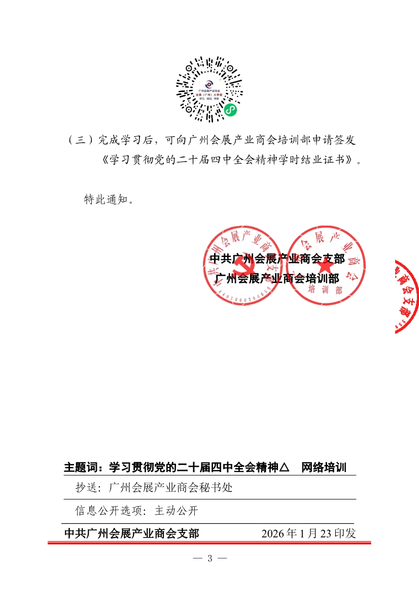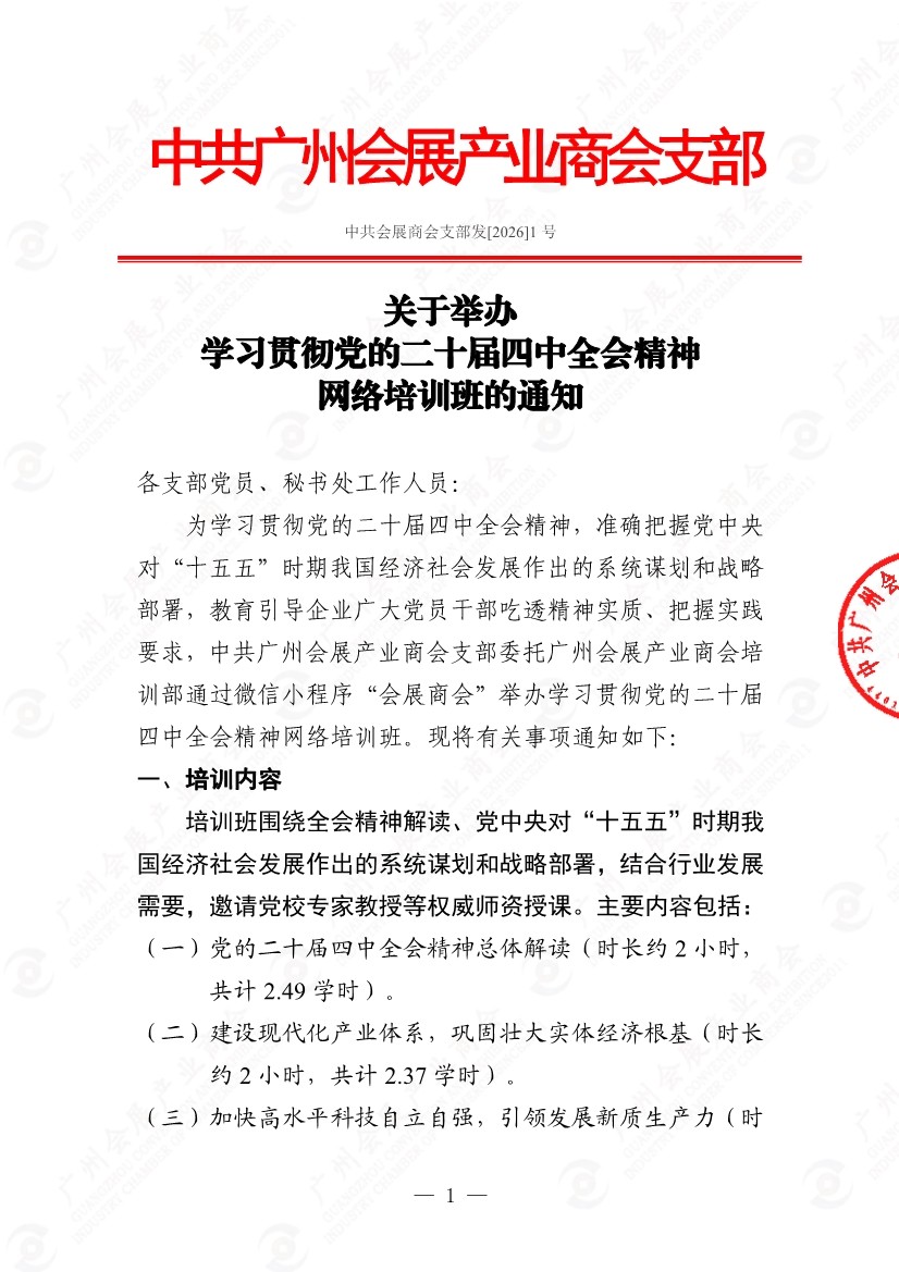 关于举办学习贯彻党的二十届四中全会精神网络培训班的通知(中共会展商会支部发[2026]1号)(已盖章生效).pdf