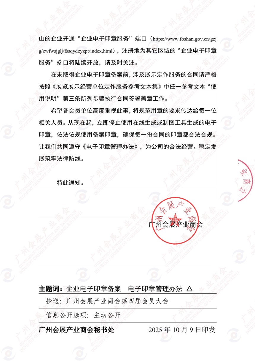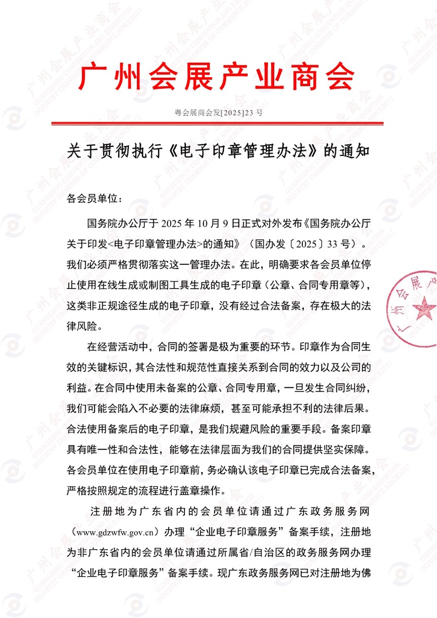 关于贯彻执行《电子印章管理办法》的通知(粤会展商会发[2025]23号)
